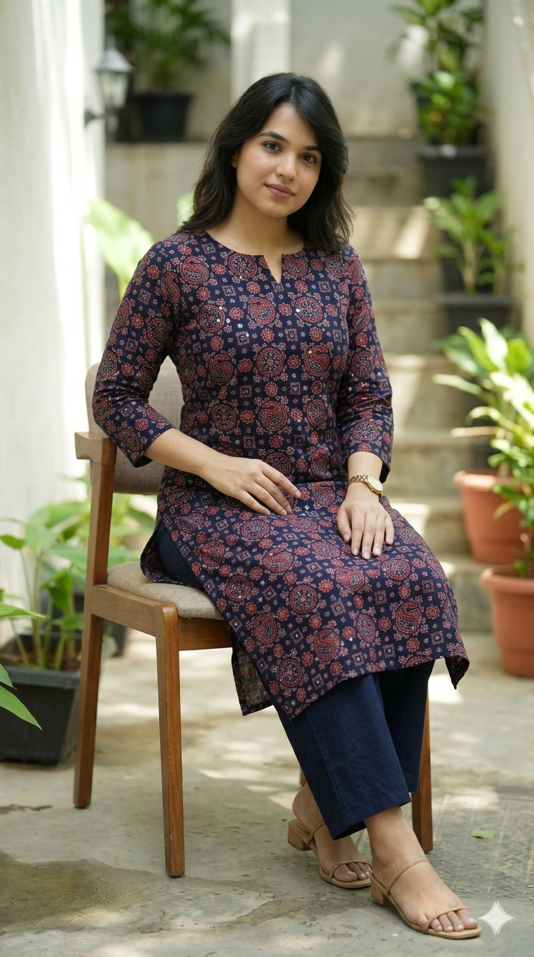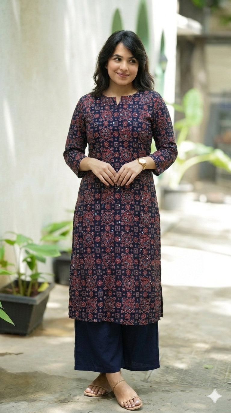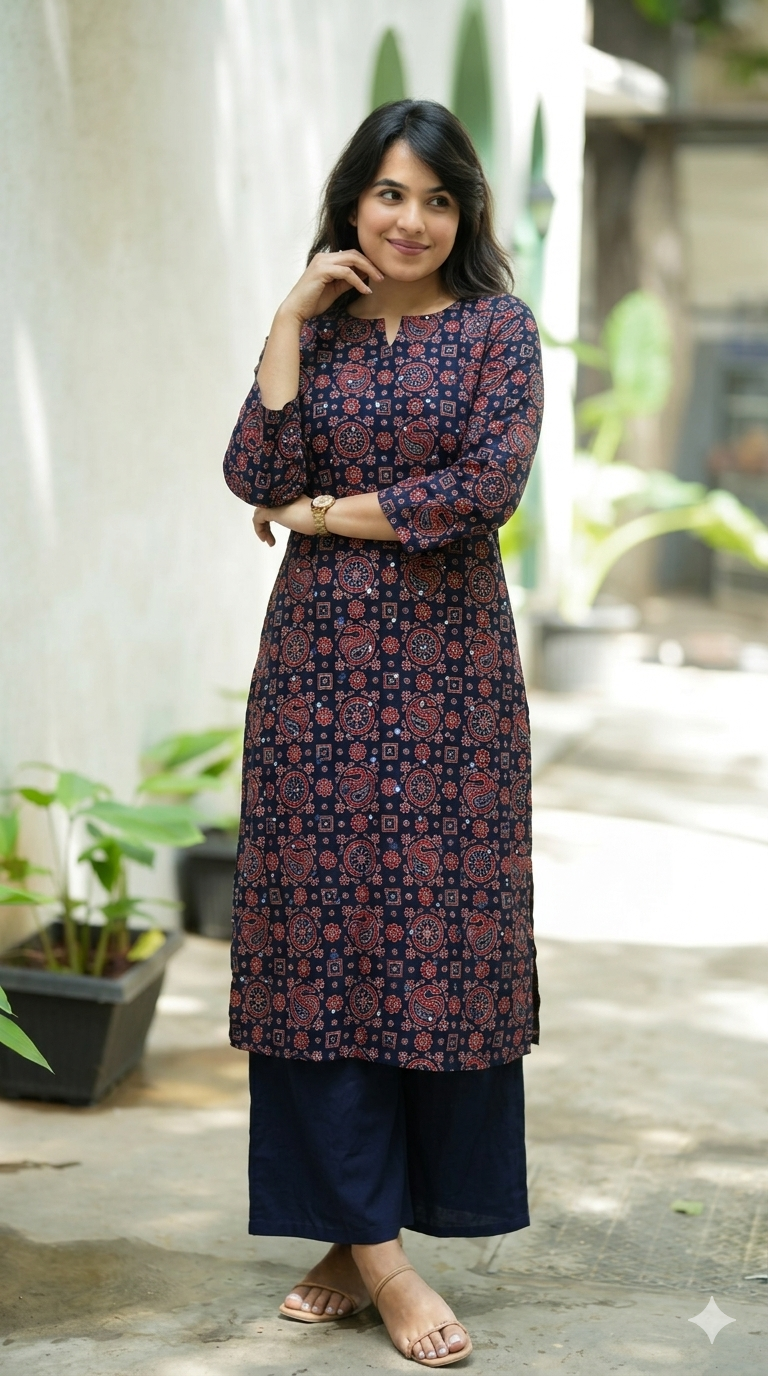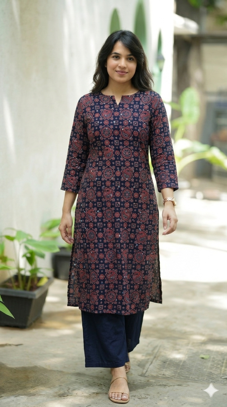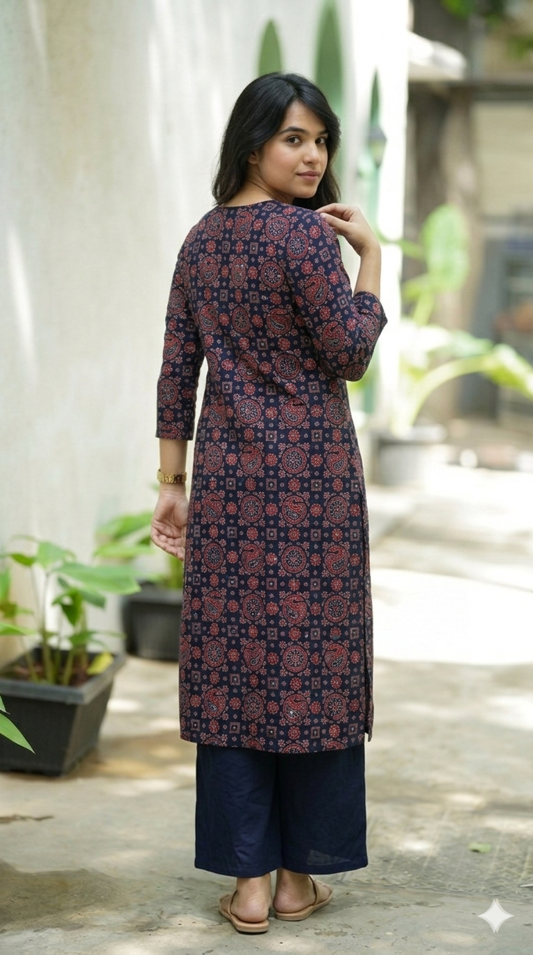 Add effortless style to your everyday wardrobe with this Indigo Paisley Printed Kurti Set. Designed with a classic straight fit and traditional prints, it offers both comfort and elegance for daily wear.