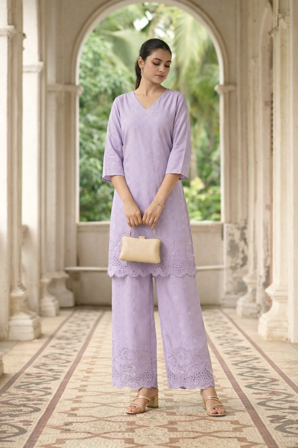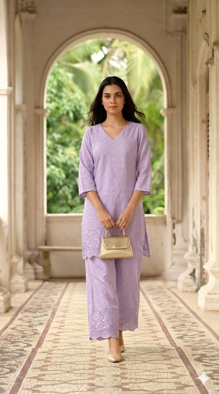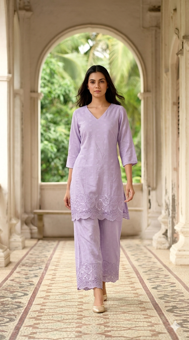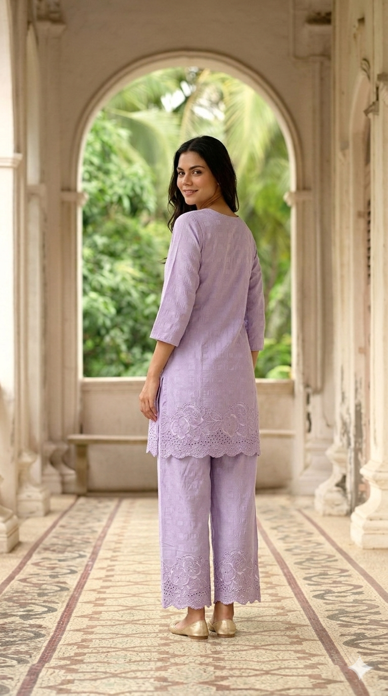 Elegant lavender co-ord set with subtle embroidery and scalloped palazzo pants, designed for a graceful and modern look.Includes free scrunchie.