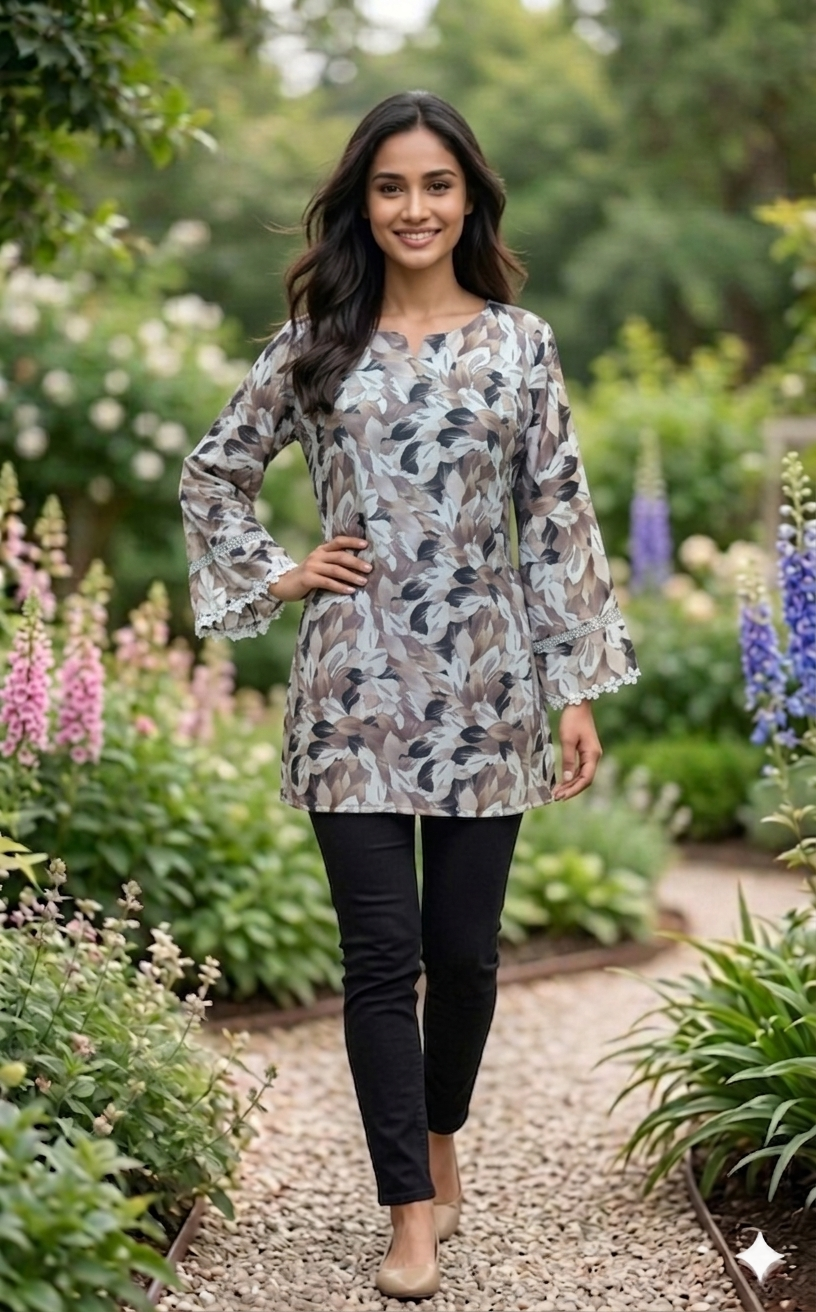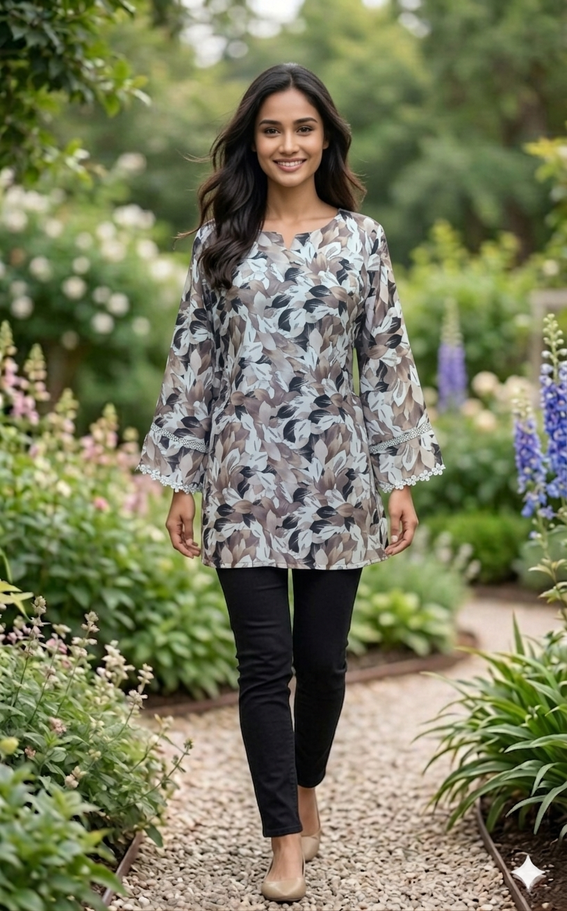 Bring effortless elegance to your wardrobe with our Mocha Leaf Print Tunic, designed with a beautiful blend of earthy tones and soft floral leaf patterns. This tunic offers a perfect balance of style and comfort for your everyday wear.