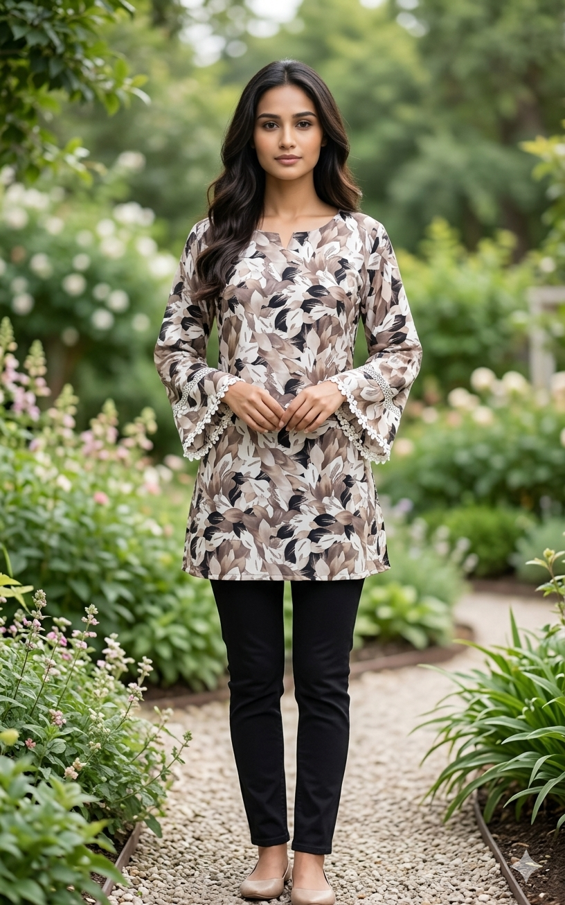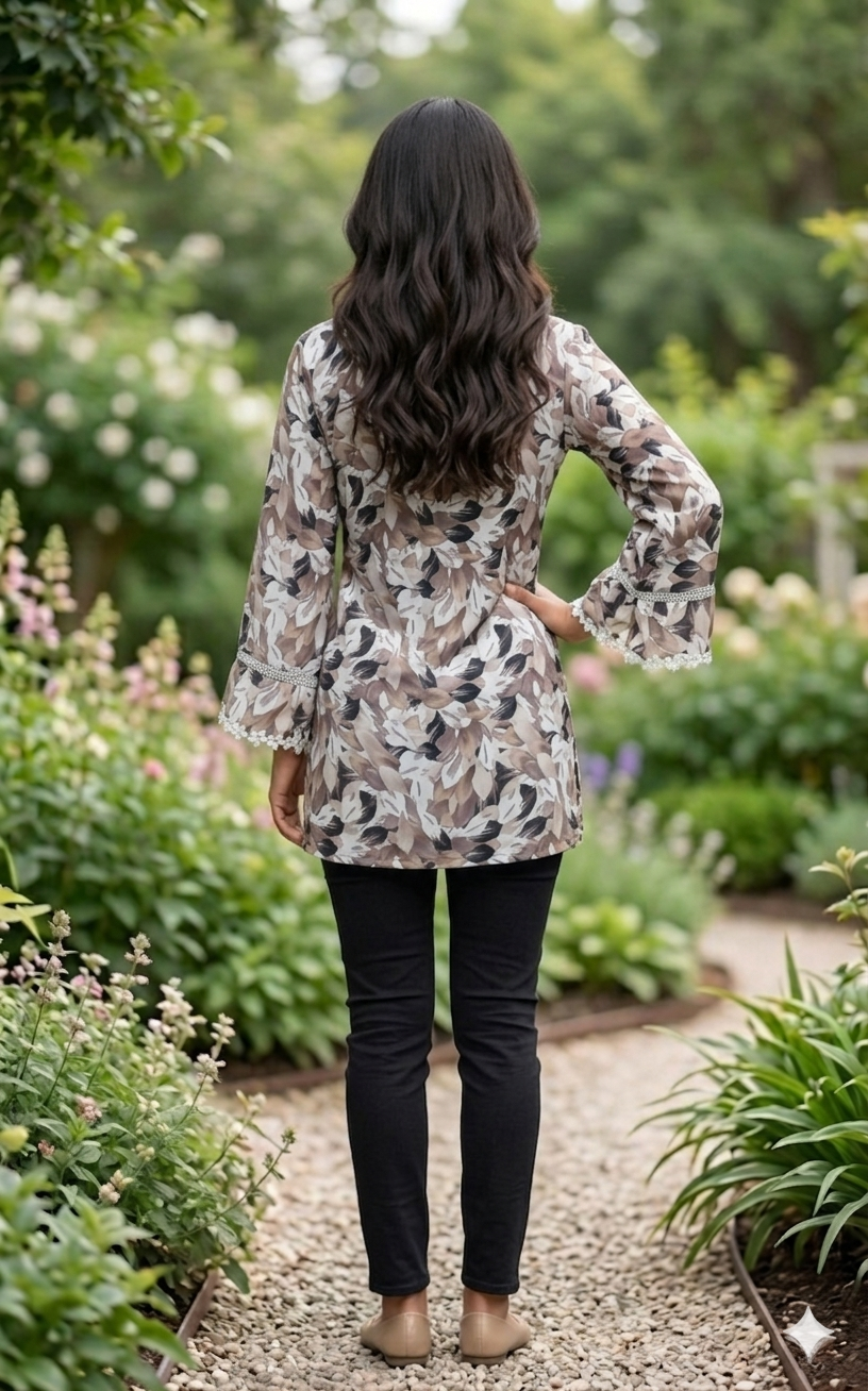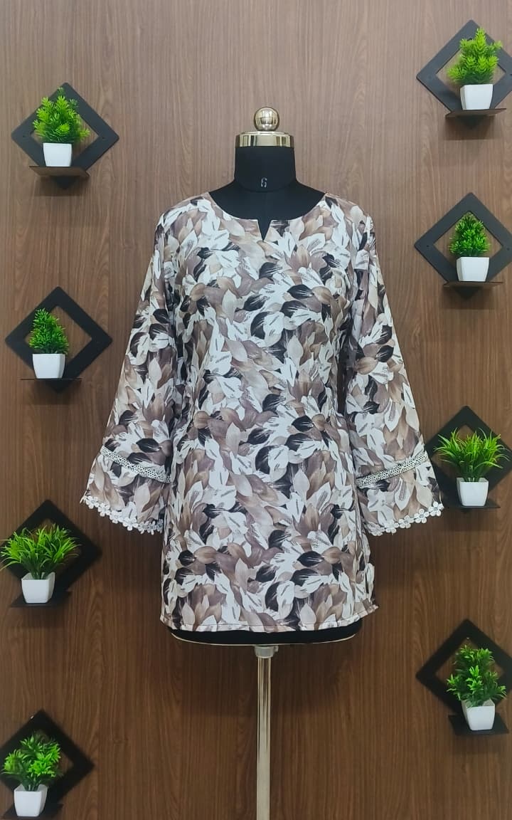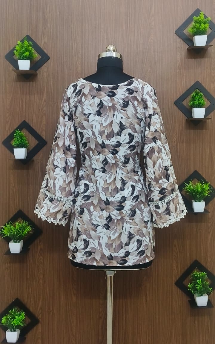 Mocha leaf print tunic with lace sleeve detail and straight fit. Elegant, breathable, and perfect for daily wear. Includes free scrunchie.