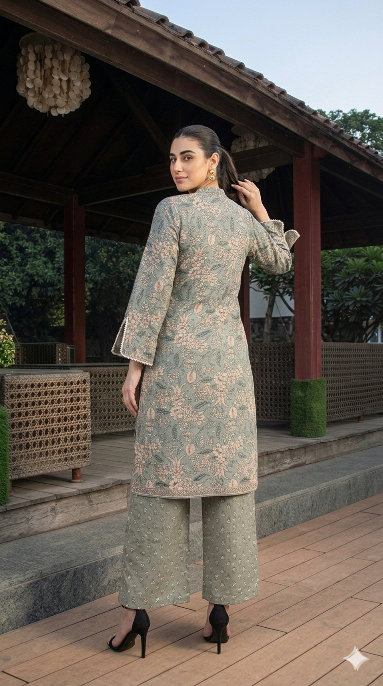 Elegant sage green kurti set with delicate floral prints and flared sleeves, paired with stylish palazzo pants.Includes free scrunchie.