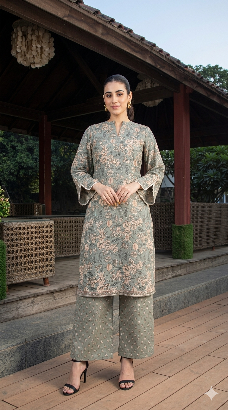 The kurti is designed with a flattering notch neckline and stylish flared sleeves, adding a contemporary touch to the classic silhouette. Paired with matching palazzo pants featuring subtle prints, this set creates a flowy and polished look for any occasion.