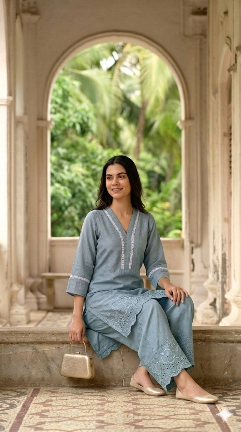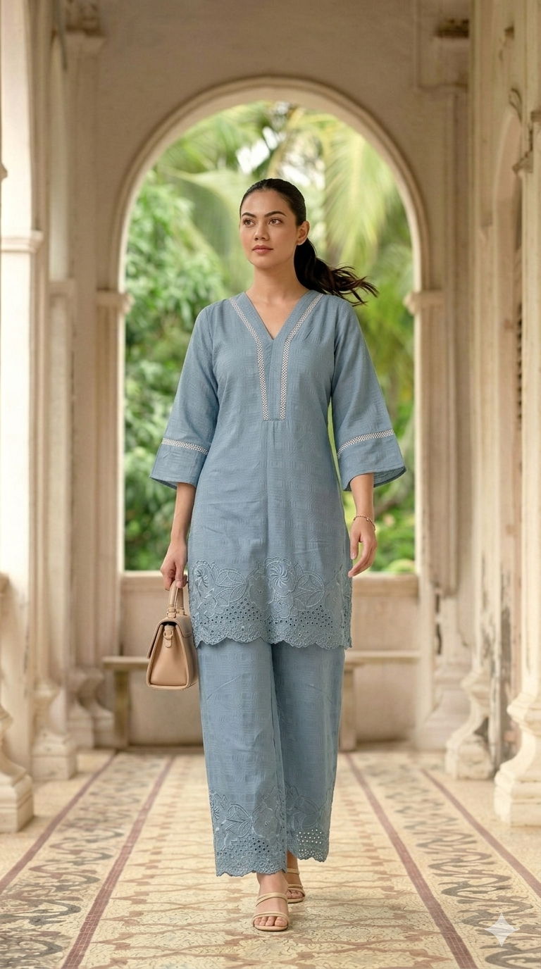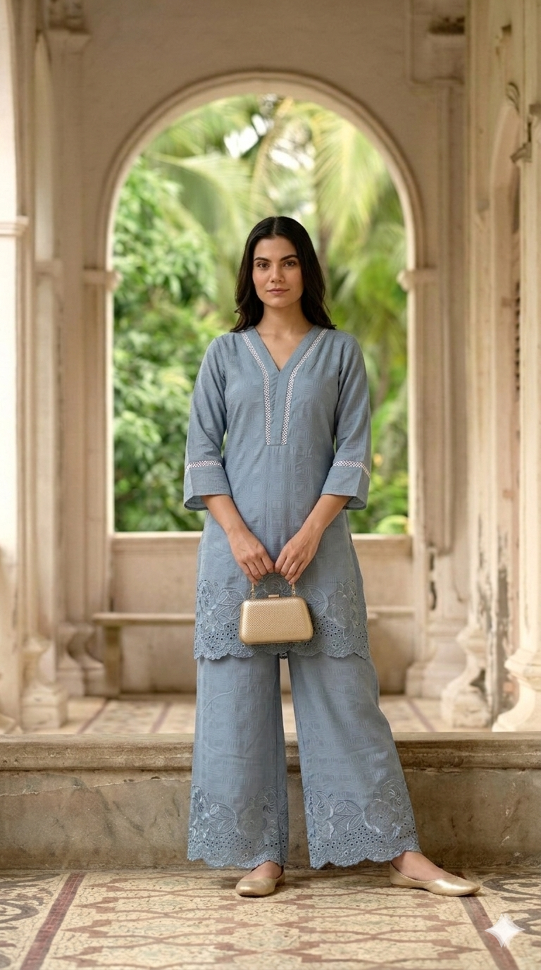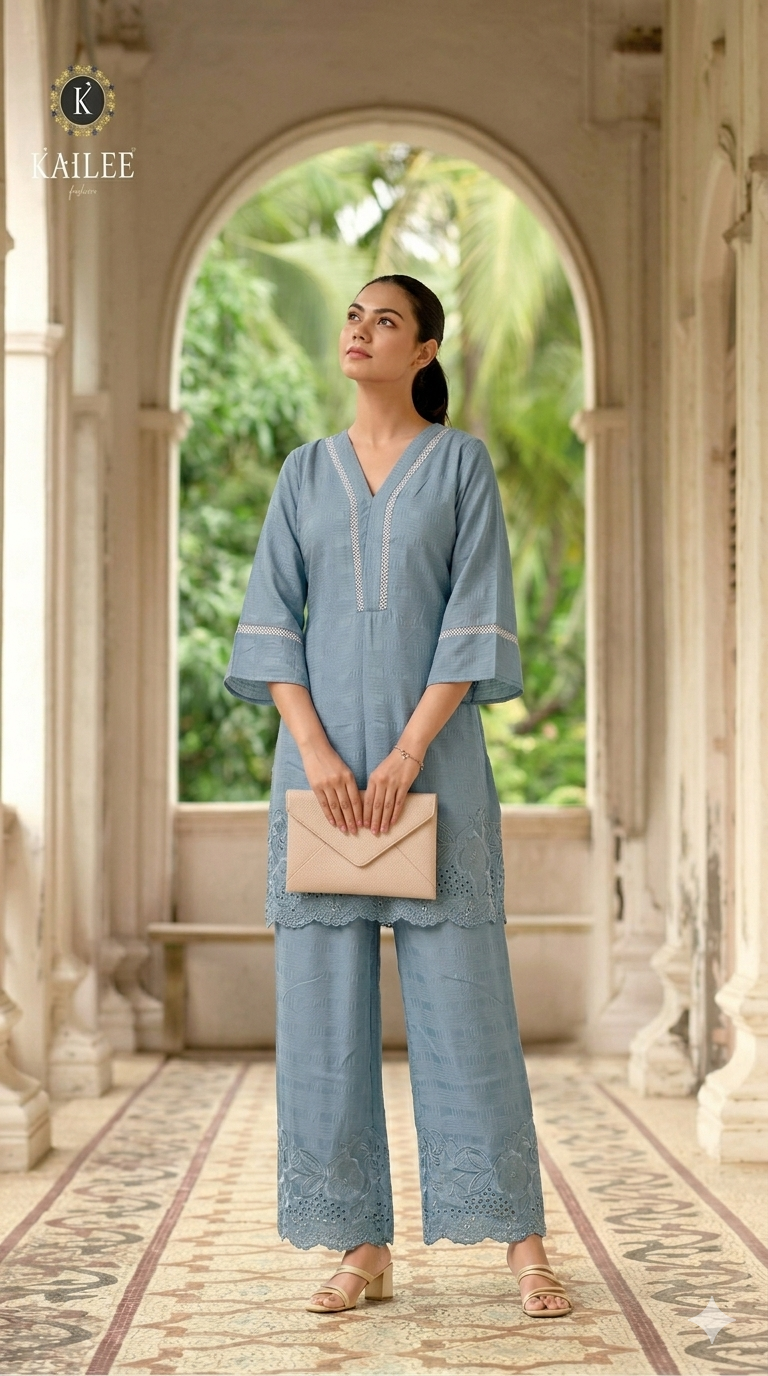 The kurti is designed with a stylish V-neckline and relaxed 3/4 sleeves, enhanced with minimal embroidery detailing. Paired with wide-leg palazzo pants featuring scalloped embroidered hems, this set creates a flowy and elegant silhouette suitable for any occasion.