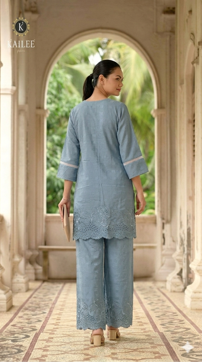 Elegant steel blue kurti set with subtle embroidery and scalloped palazzo pants, designed for a refined and graceful look.Includes free scrunchie.